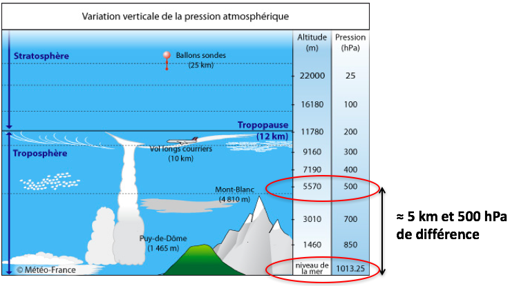 Par exemple, en s’élevant d’une distance de 5 km, la pression est réduite de moitié par rapport à sa valeur à la surface.
